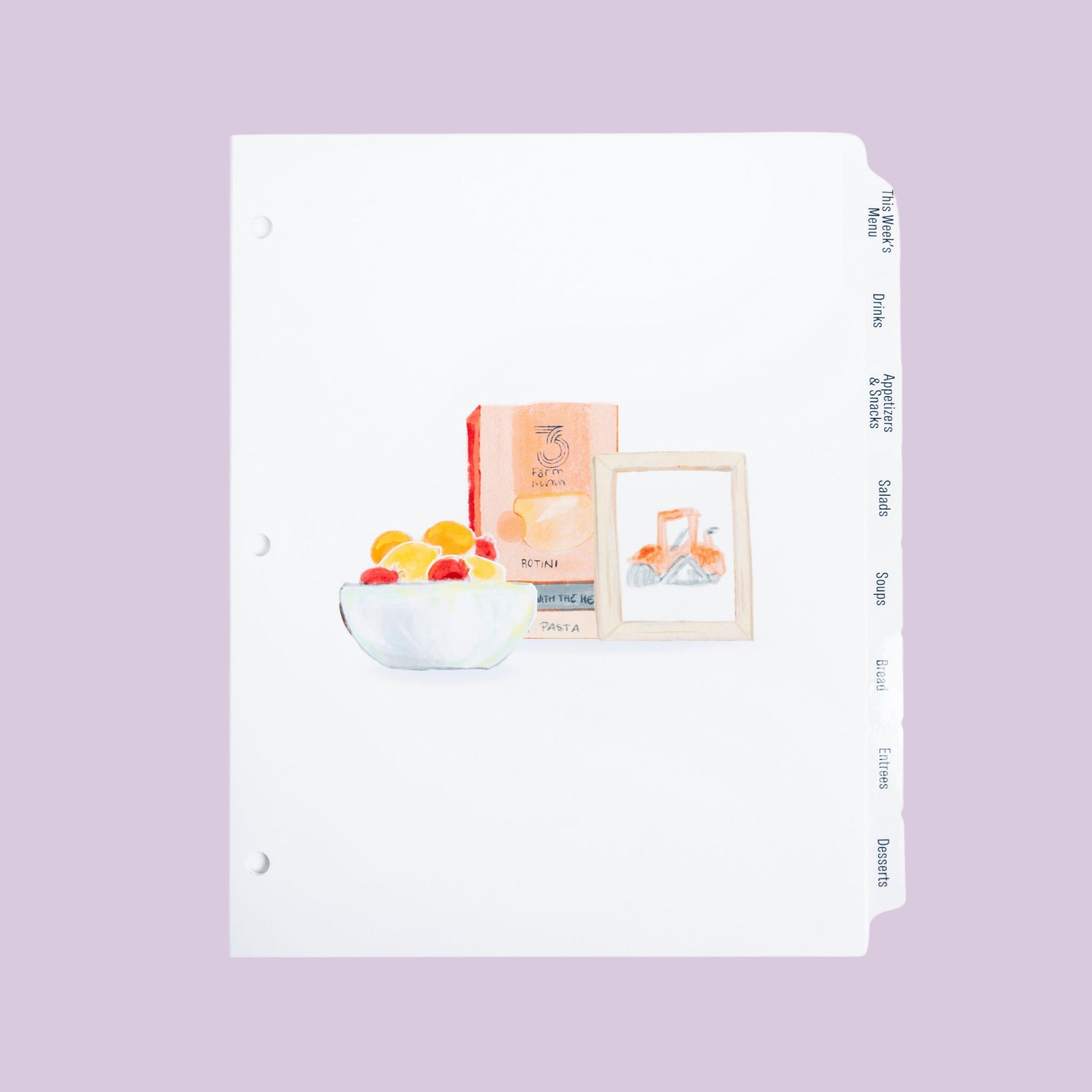 The perfect addition to your Recipe Binder! The set includes 8 tabs: This Week's Menu (so you can pull your favorites and have them ready to go for the week!), Drinks, Appetizers & Snacks, Salads, Soups, Breads, Entrees, Desserts.